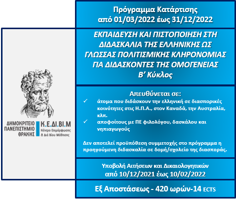 Το Κέντρο Επιμόρφωσης και Διά Βίου Μάθησης (Κ.Ε.ΔΙ.ΒΙ.Μ.) του Δ.Π.Θ. διοργανώνει για δεύτερη φορά (β` κύκλος) το επιμορφωτικό πρόγραμμα με τίτλο «ΕΚΠΑΙΔΕΥΣΗ ΚΑΙ ΠΙΣΤΟΠΟΙΗΣΗ ΣΤΗ ΔΙΔΑΣΚΑΛΙΑ ΤΗΣ ΕΛΛΗΝΙΚΗΣ ΩΣ ΓΛΩΣΣΑΣ ΠΟΛΙΤΙΣΜΙΚΗΣ ΚΛΗΡΟΝΟΜΙΑΣ ΓΙΑ ΔΙΔΑΣΚΟΝΤΕΣ ΤΗΣ ΟΜΟΓΕΝΕΙΑΣ» από 01/03/2022 έως 31/12/2022.
